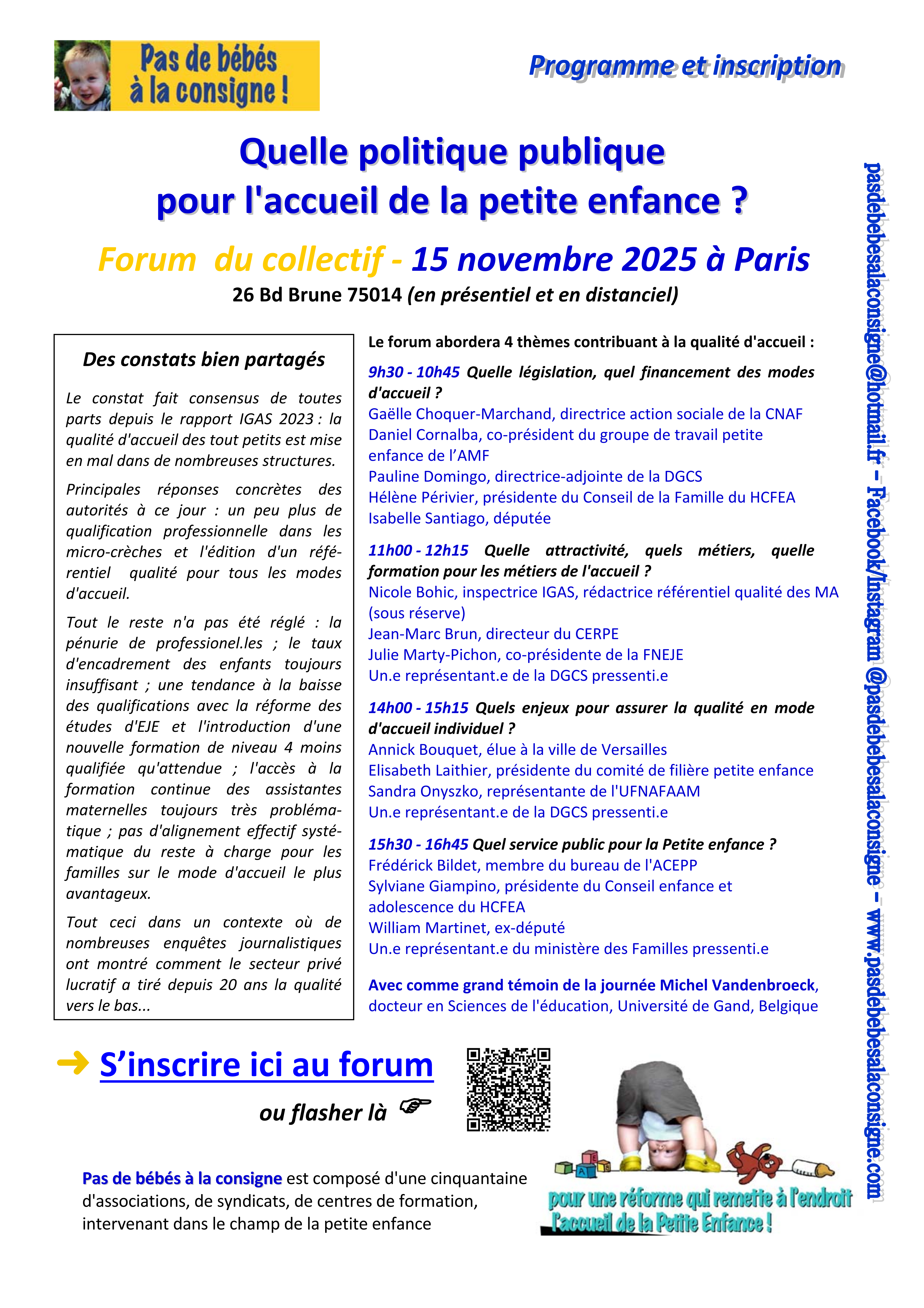 6 avrilLa pétition du collectif "Pas de bébés à la consigne" à l’automne 2024 a recueilli près de 10 000 signatures. Depuis une nouvelle ministre chargée de la famille et de l’enfance a été nommée, Madame Catherine Vautrin. Le gouvernement vient d’aligner la réglementation des micro-crèches sur celle des petites crèches, ce qui est un premier pas pour rétablir la qualité d’accueil. Mais les principales préconisations du rapport de l’IGAS et des commissions parlementaires concernant l’ensemble des (…)